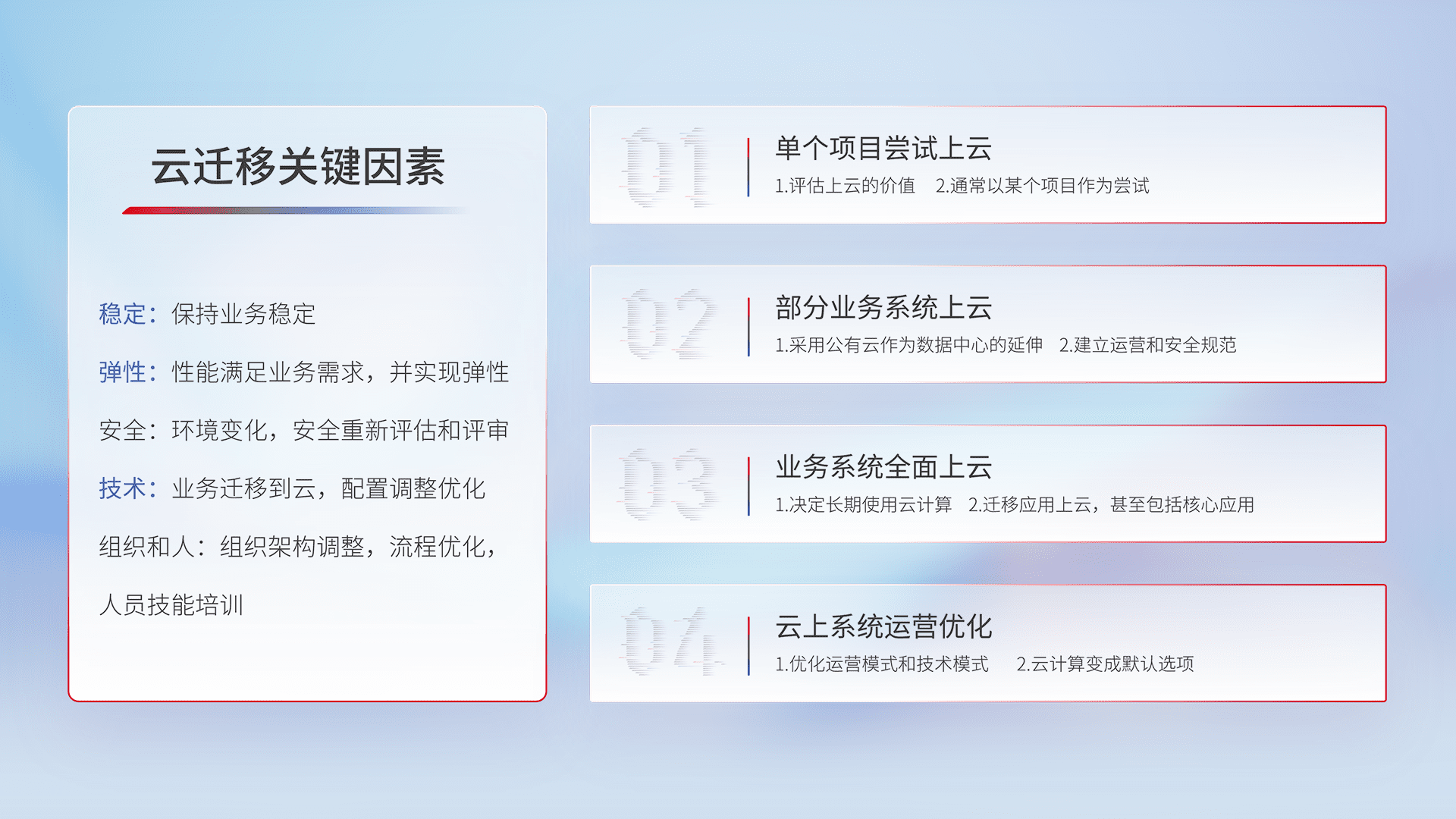 结合实际业务,,,从规划设计、、云平台选型、、、云原生改造、、、数据迁移、、、集成交付,,迁移全过程为客户识别最佳上云路径,,做好风险识别管理,,,,设计网络架构、、身份权限、、、、安全审计合规、、、、操作审计、、日志审计、、、监控告警策略、、、多站点容灾设计等,,,对云上基础设施进行整体规划,,,提升IT治理水平,,,,以满足弹性、、、高可用、、高性能的需求。。。