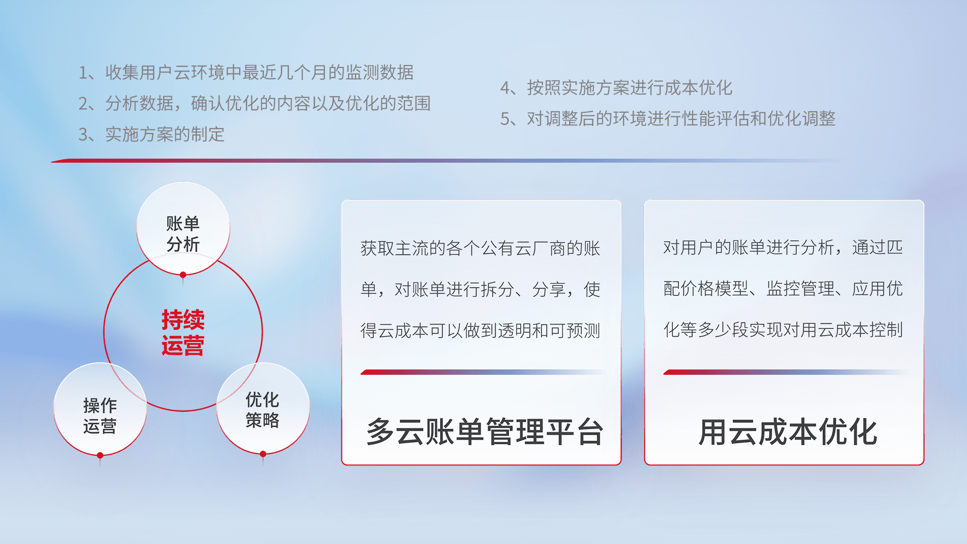 通过多云纳管,,,以统一的资源数据模型把客户的云资源进行抽象和封装,,,进而实现对多云资源的统一操作,,,保障云资源管理的可靠性、、、、稳定性与可用性。。。。量身定制化运维内容,,,配置、、、开发运维、、、、补丁管理、、、备份、、监控、、、、认证和访问管理、、、审计和日常巡检等,,保障在用云过程中的可靠度,,,稳定度以及高可用率。。